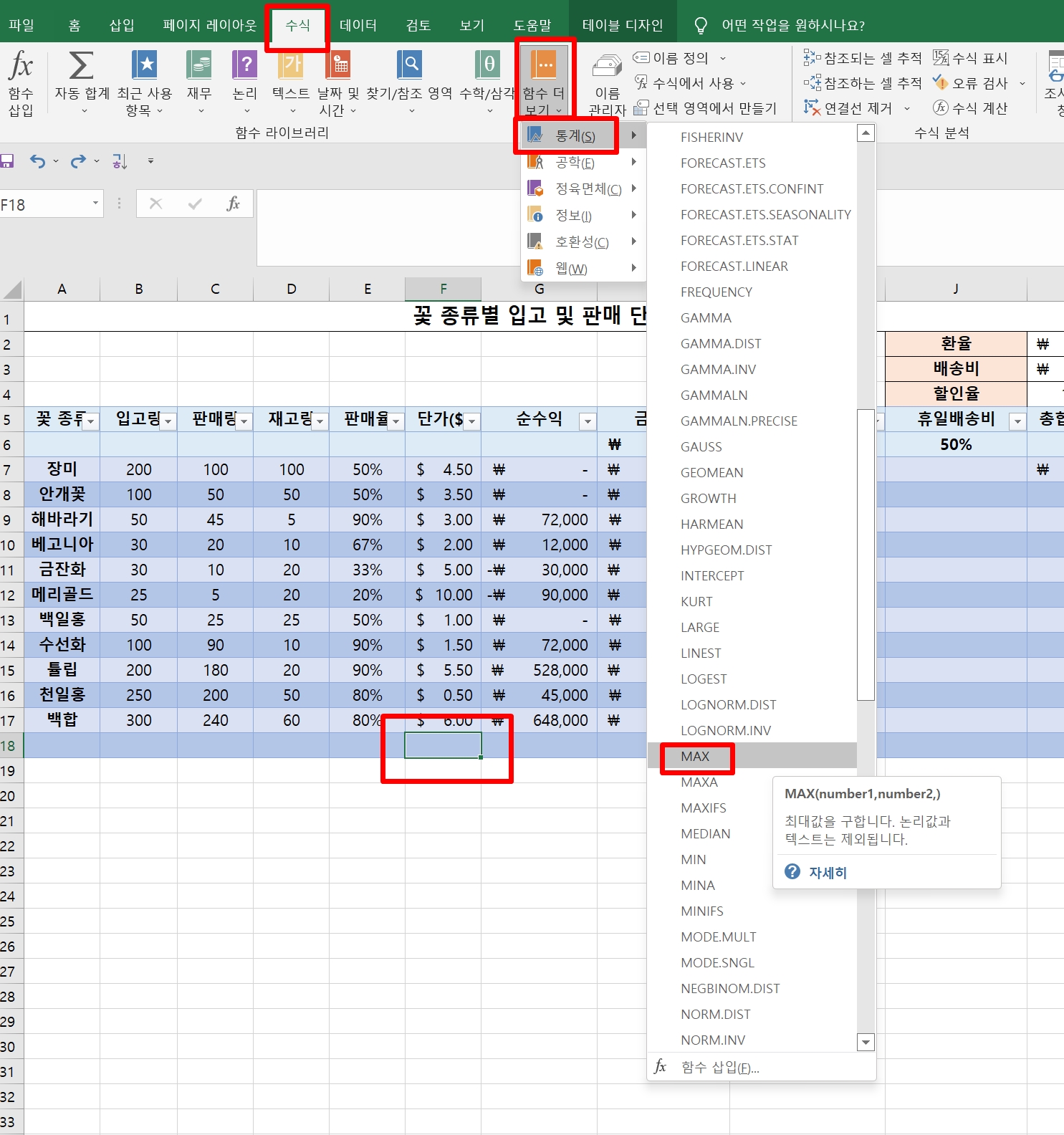 2. [수식] -> [합수 라이브러리] 클릭 -> [통계] -> 스크롤을 내려 MAX 클릭한다.