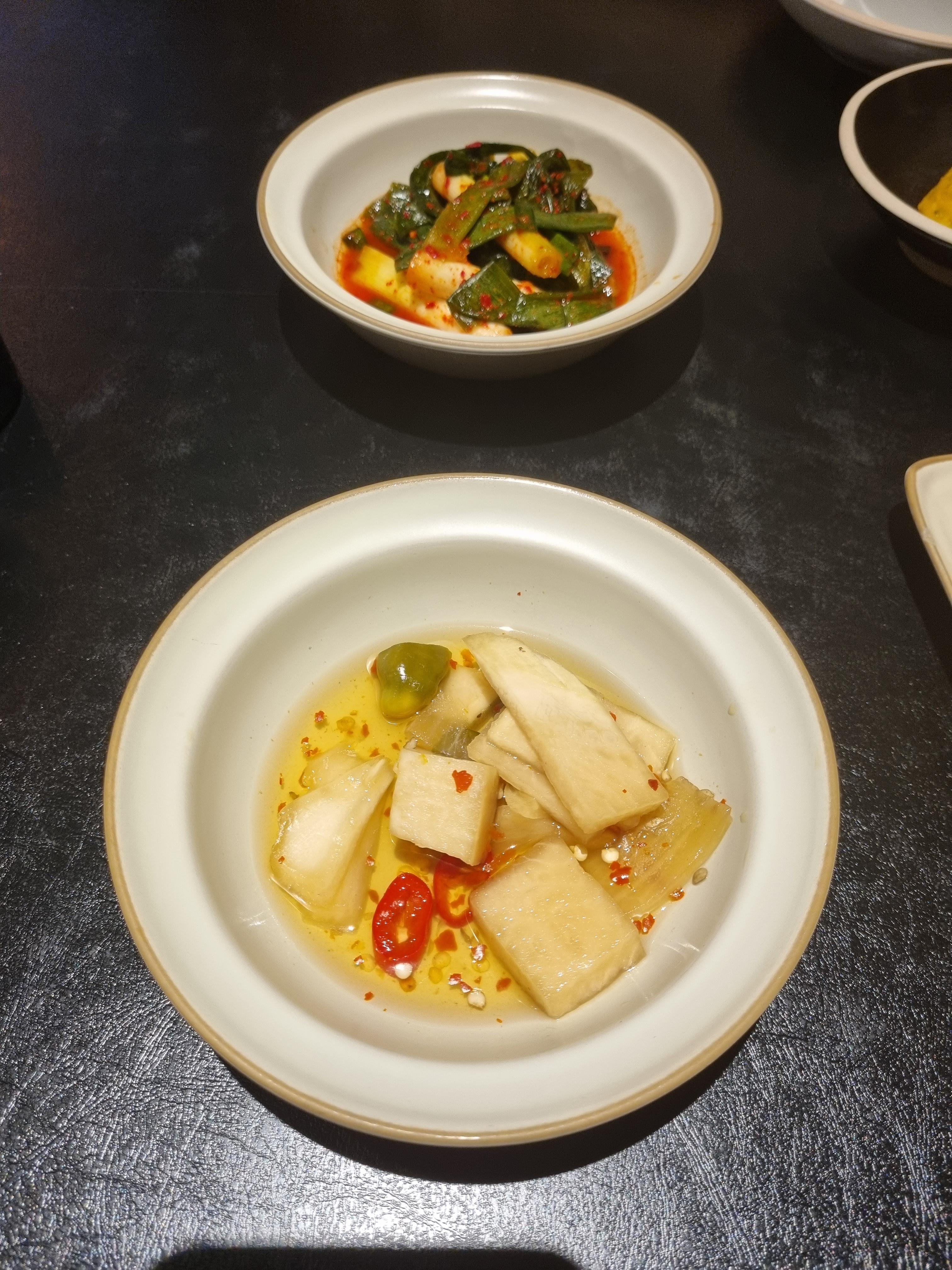 반찬으로는 무절임장아찌와 파김치, 깻잎장아찌, 콩나물 무침이 나온다.