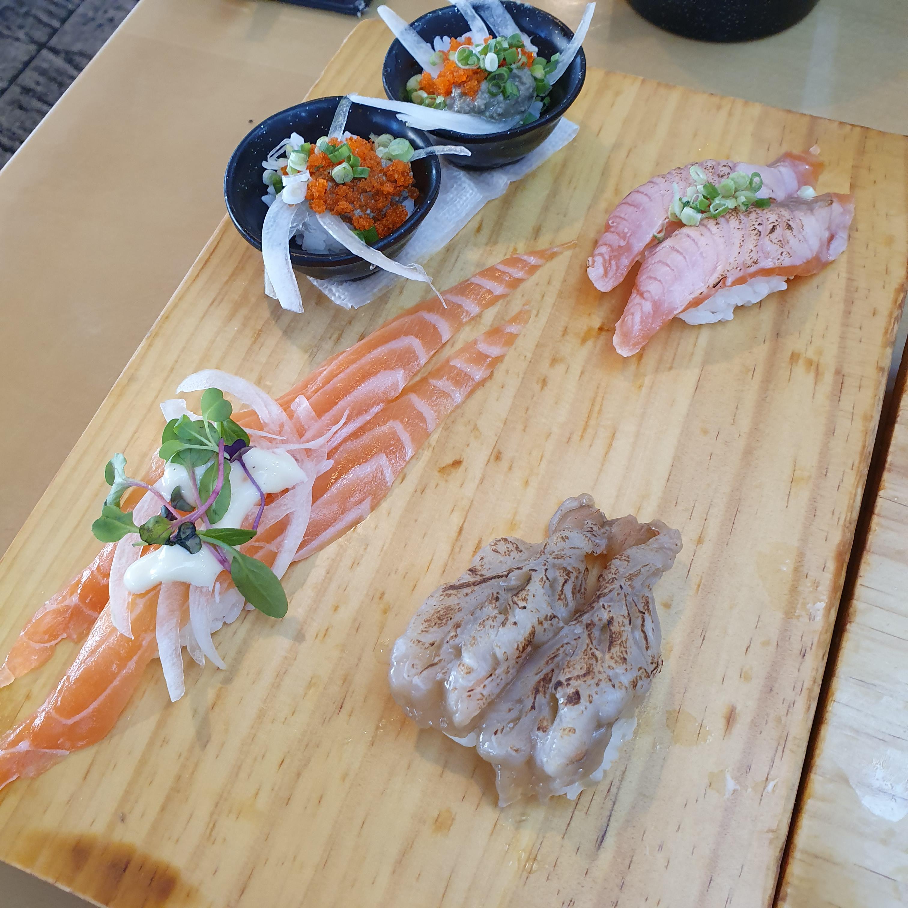 마지막 판은 연어와 새우 등이다. 마지막을 아주 깔끔하게 마무리 해주는 것 같다. 앞서 언급했듯 초밥만으로 배부르기는 어렵지만, 밥 양을 작게하고 생선의 크기를 크게해서 만족도가 상당히 높은 편이다.