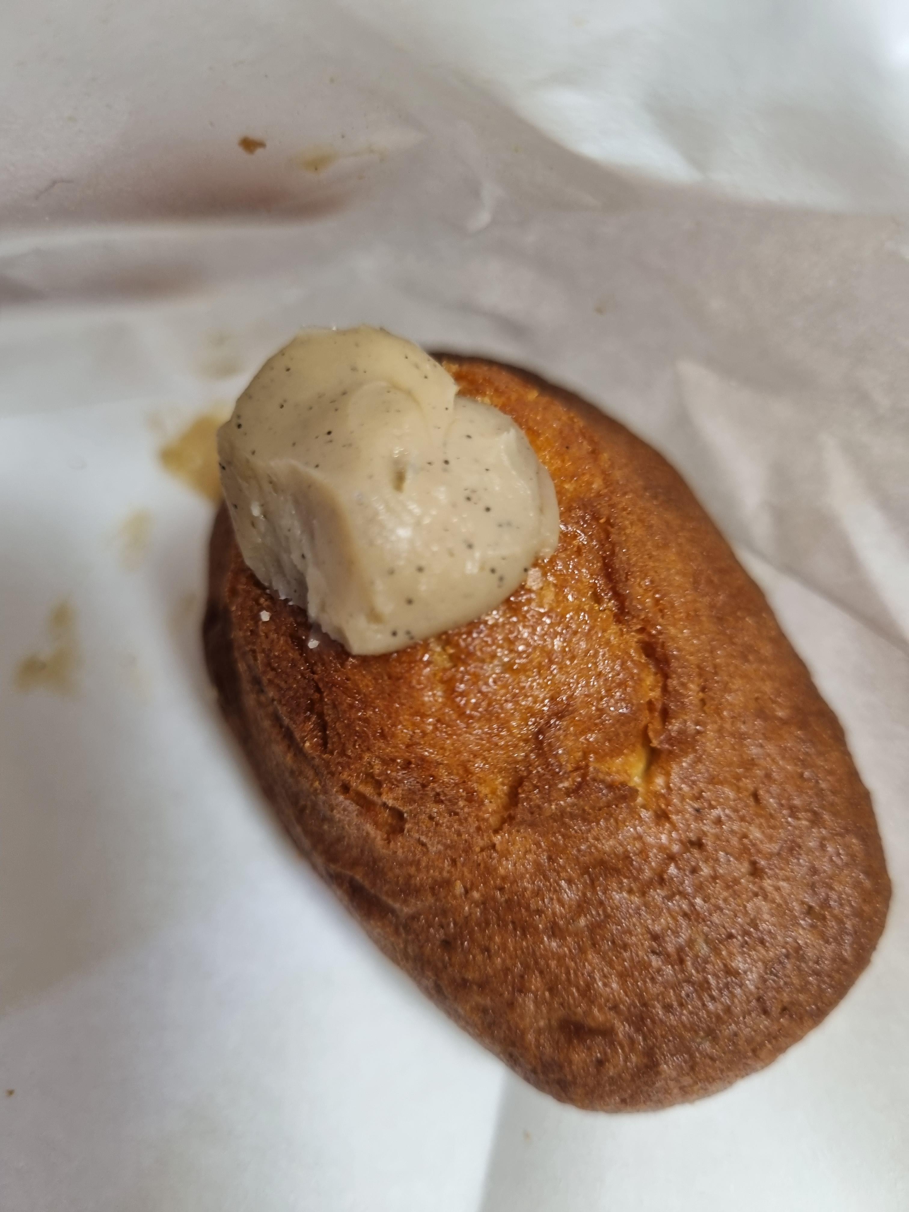 마들렌 안에 타히티 바닐라를 한가득 넣어서 바닐라맛을 입안 가득 느낄 수 있다.