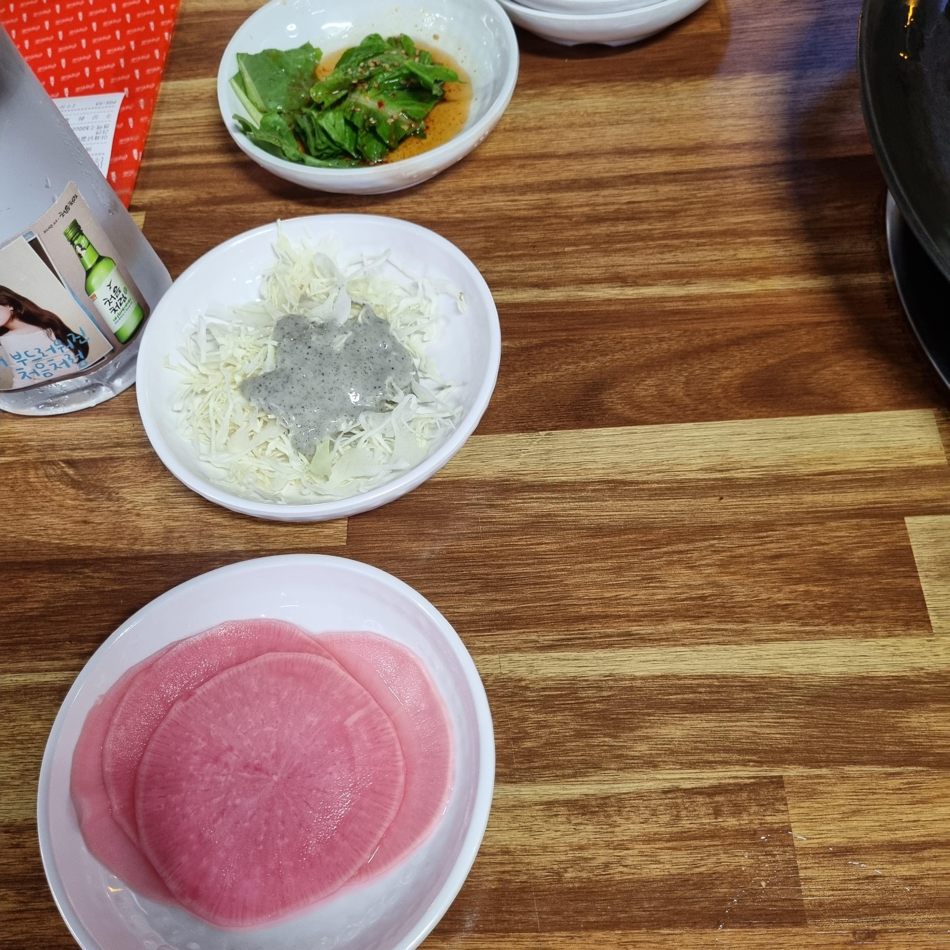 무쌈과 흑임자소스 샐러드, 간단한 겉절이가 제공된다.