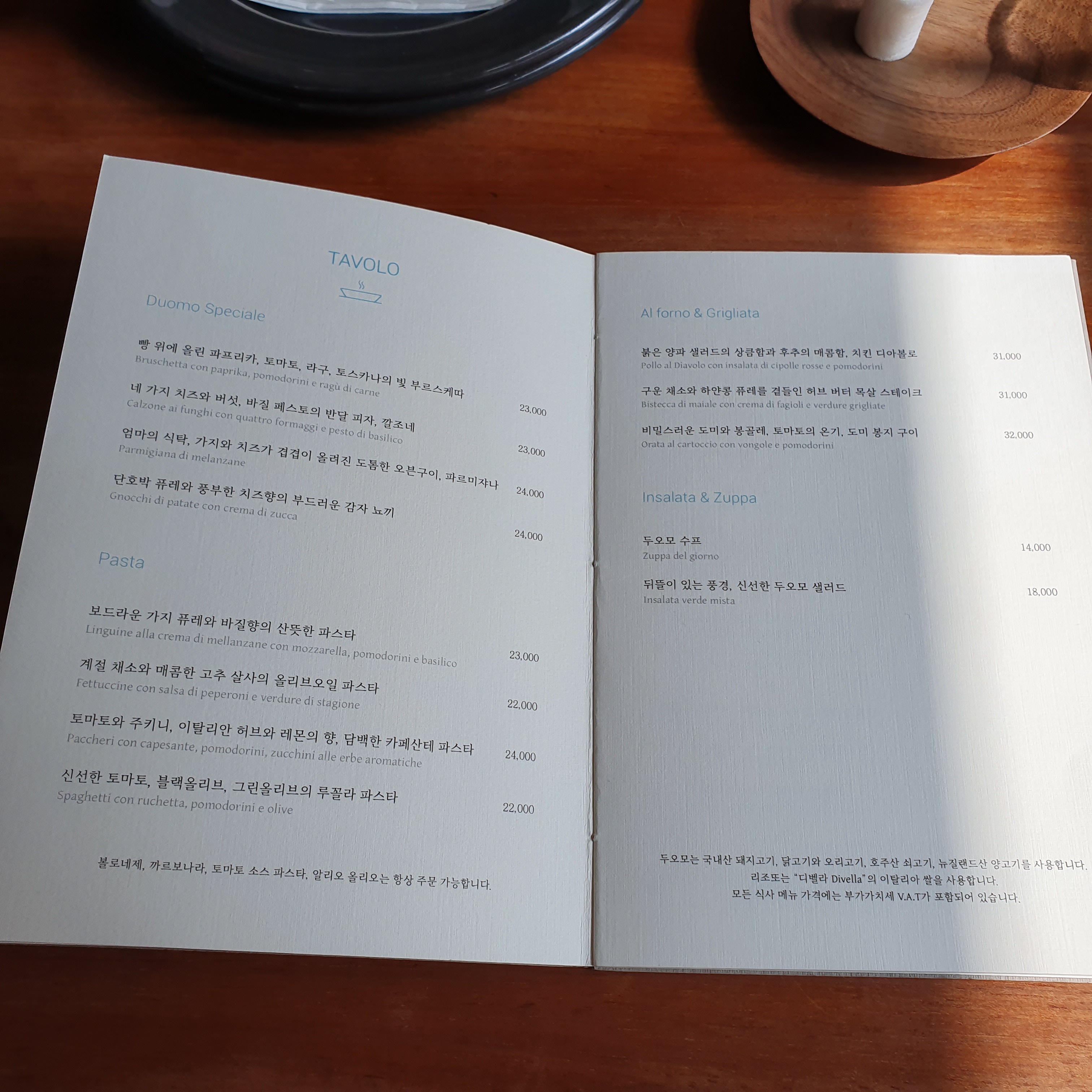 이름이 꽤 길지만, 이름 안에 모든 음식의 재료가 다 표현되어 있다. 이 메뉴는 칠판에 적혀있는 스페셜메뉴 중 하나다. 일단 이 시간에는 유명한 뇨끼가 이미 솔드아웃 된 시간이었기에 파스타로 선택했다.