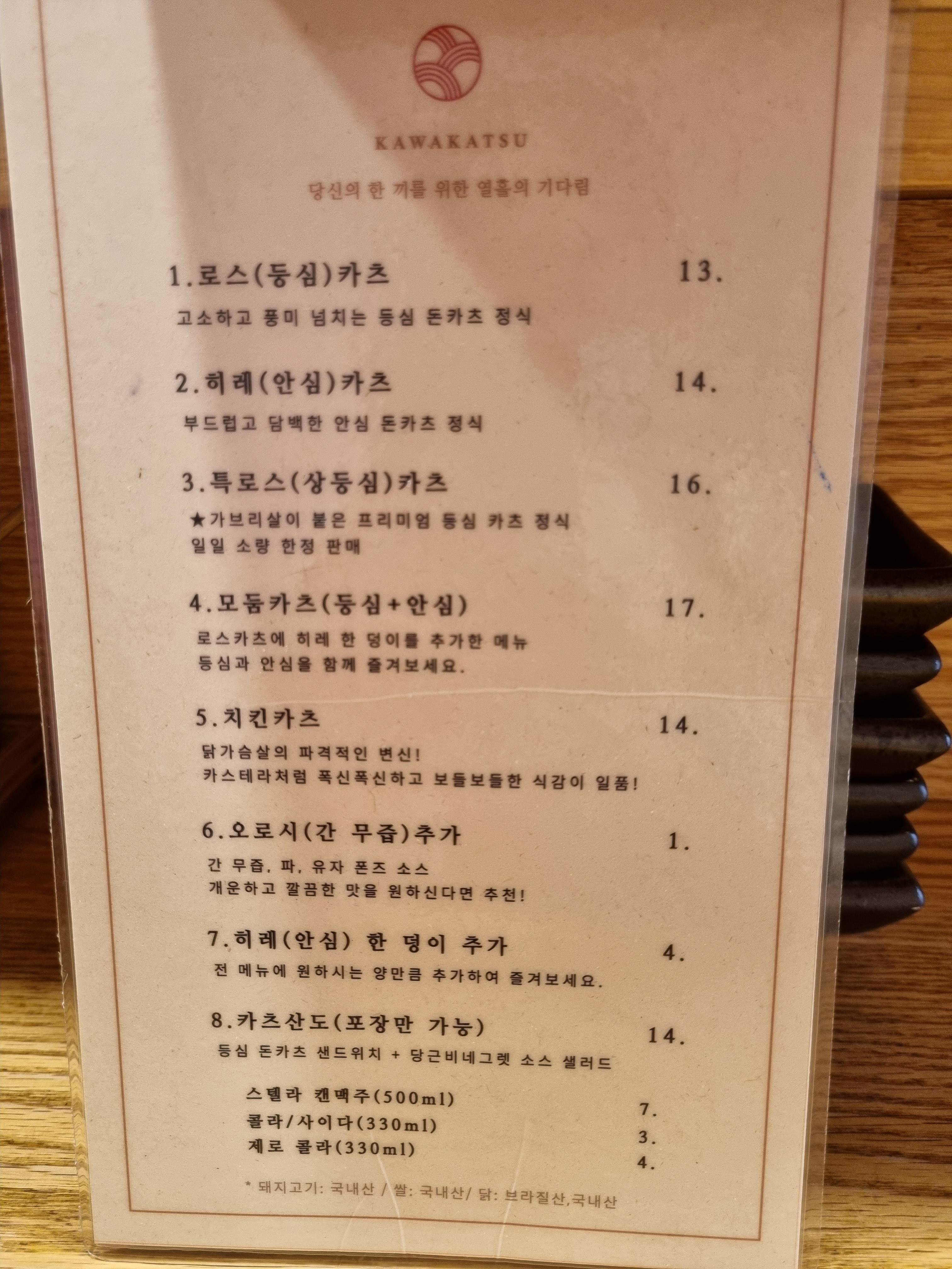 카와카츠 메뉴는 총 8가지인데, 사실 점심에 방문하는게 아니면 저걸 다 먹기는 힘들다. 브레이크타임이 끝나고 6번째로 들어갔는데 히레주문 마지막이었다. 특로스와 모둠카츠는 아예 주문이 안된다. 웨이팅했다고 다 먹을 수 있는게 아니니 참고해야한다. 직원분께서 그 다음 분들께는 전화로 지금 히레는 안된다고 안내를 해주신다.